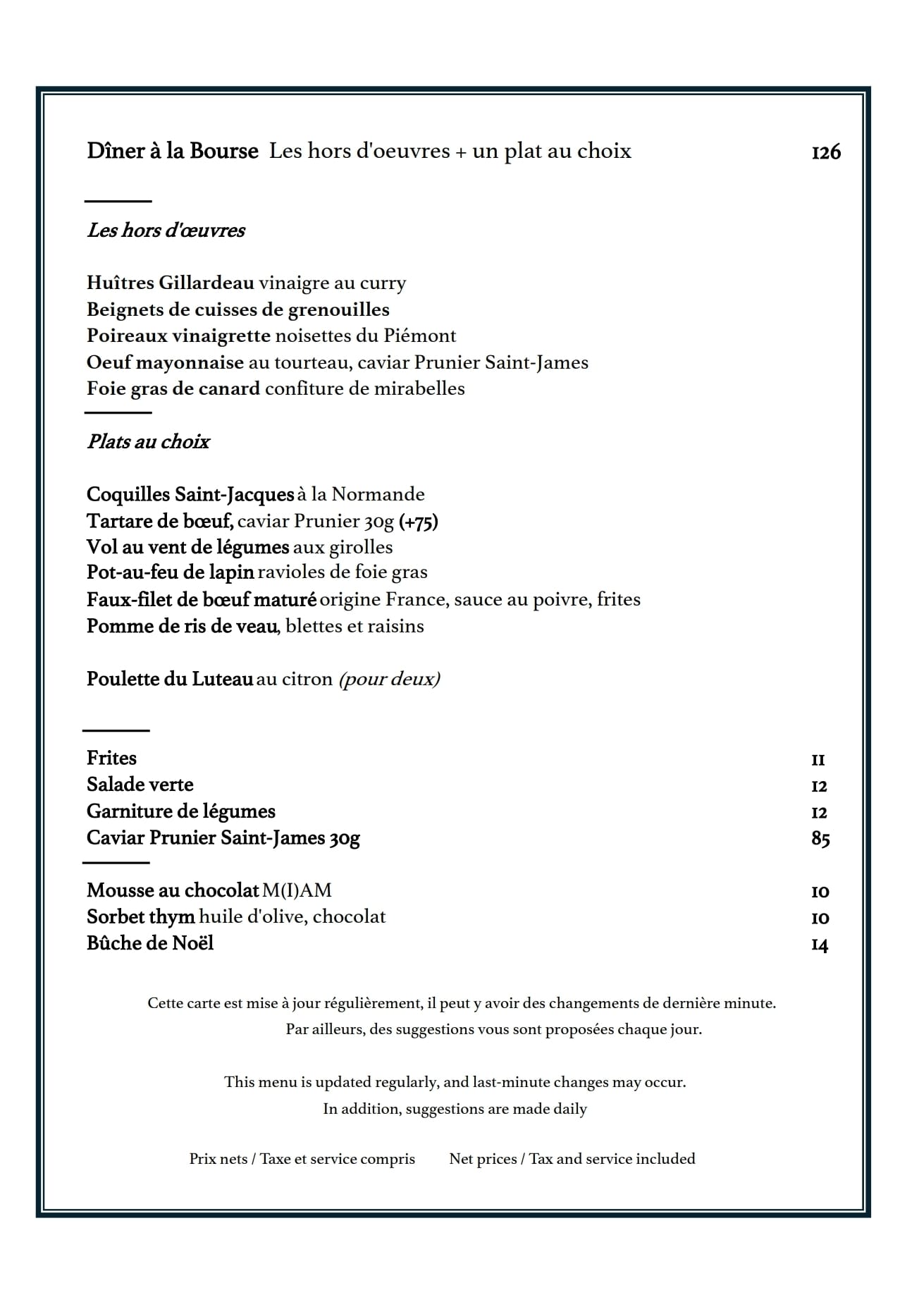 Happy and generous! A cosy green and grey velvet setting, La Bourse Et La Vie is a bourgeois bistro where we offer a selection of daily specials for lunch and à la carte dinners.
